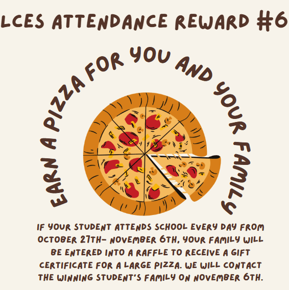 Congratulations to our Oct 13th-23rd pizza attendance challenge winner! We hope your family enjoys some delicious pizza and thank you for having zero absences for the last 2 weeks of school! Remember to use the attendance tracking calendar at home with your student to help your student keep on track for all of the fun challenges and prizes we have regarding attendance this year. See details about our next pizza attendance challenge and the semester 1 attendance challenge in the fliers section below!