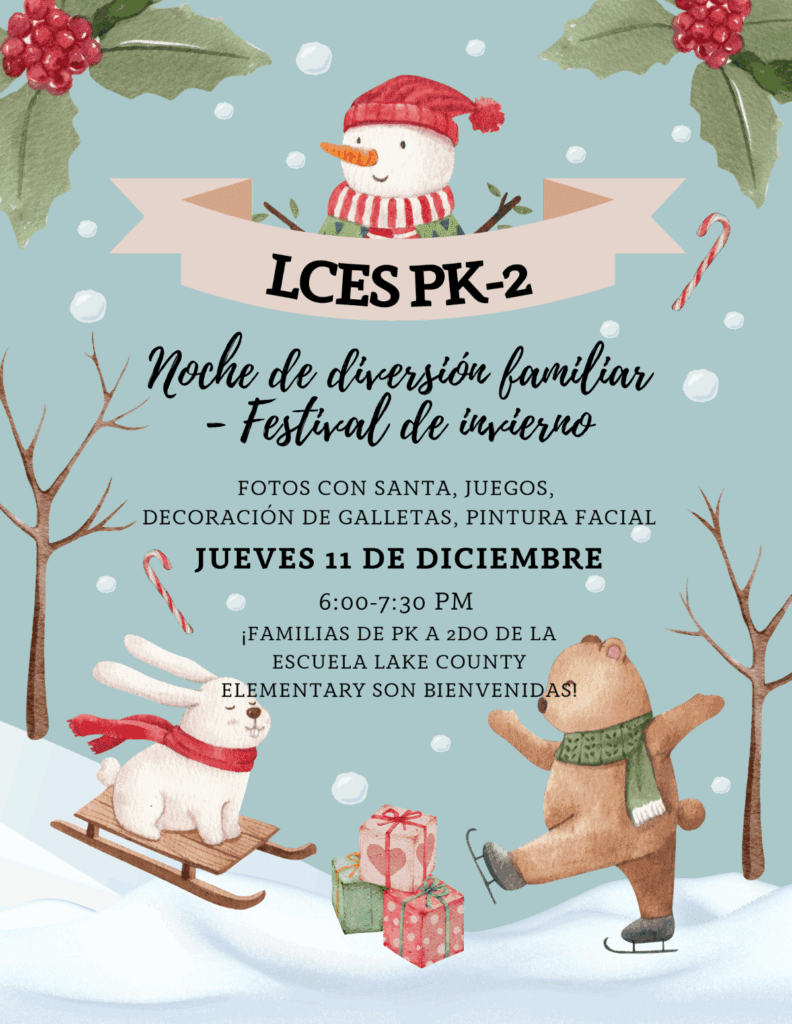 - December 11 – PreK-2nd grade Winter Festival Family Fun Night at LCES 6:00-7:30