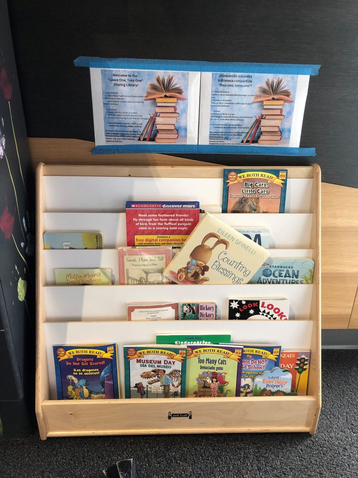 Next is our Shared Library. This was put together last year by Lisa Benton, one of our preschool teachers who currently teaches Kindergarten right here at LCES. Feel free to leave a book or take a book. This is intended for you to bring books for other families to enjoy and to take a new one home to read with your family.