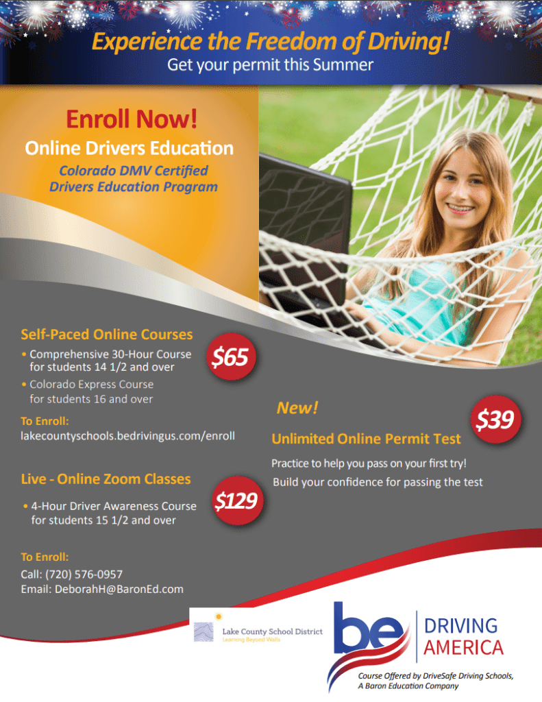 Your choice of driver’s education is an important milestone in your student’s life. Summer break is an excellent time for students 14 ½ and older to start taking classes for a Colorado permit. When you choose the online program, hosted through LAKE COUNTY SCHOOL DISTRICT, you can help your student become a safe driver for life and support your school at the same time!