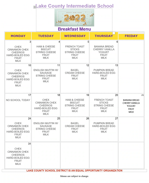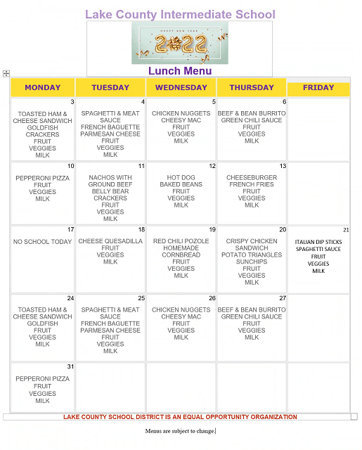 Please see below for our January lunch and breakfast menus. Starting in January, we will be more environmentally conscious by posting the menus on the Friday Afternoon Shout Out and sending home paper copies by parent/family request. Please let the LCIS main office know if you need a print-out of the menus by calling 719-486-6830. Thank you!