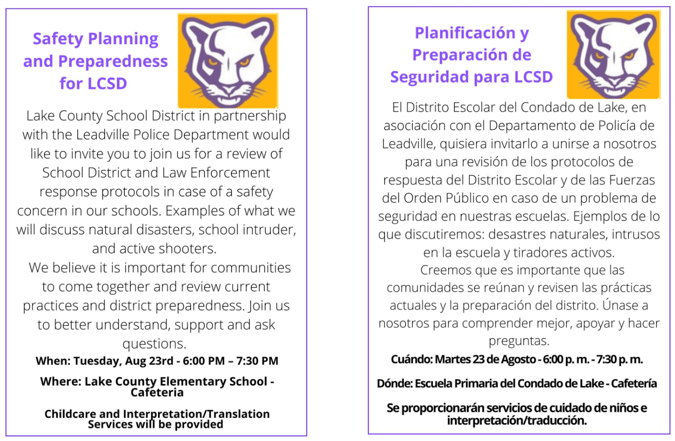 LCSD is hosting a Family Event where we will be discussing safety planning and preparedness for all of the schools in our district. We are partnering with the Leadville Police Department to review school district and law enforcement responses in the case of safety concerns in our schools. Examples of what we will discuss are natural disasters, school intruders, and active shooters. Join us on Tuesday, August 23rd at 6:00pm at LCES for this event. Interpretation and childcare will be provided. Please see the flier below for more information.