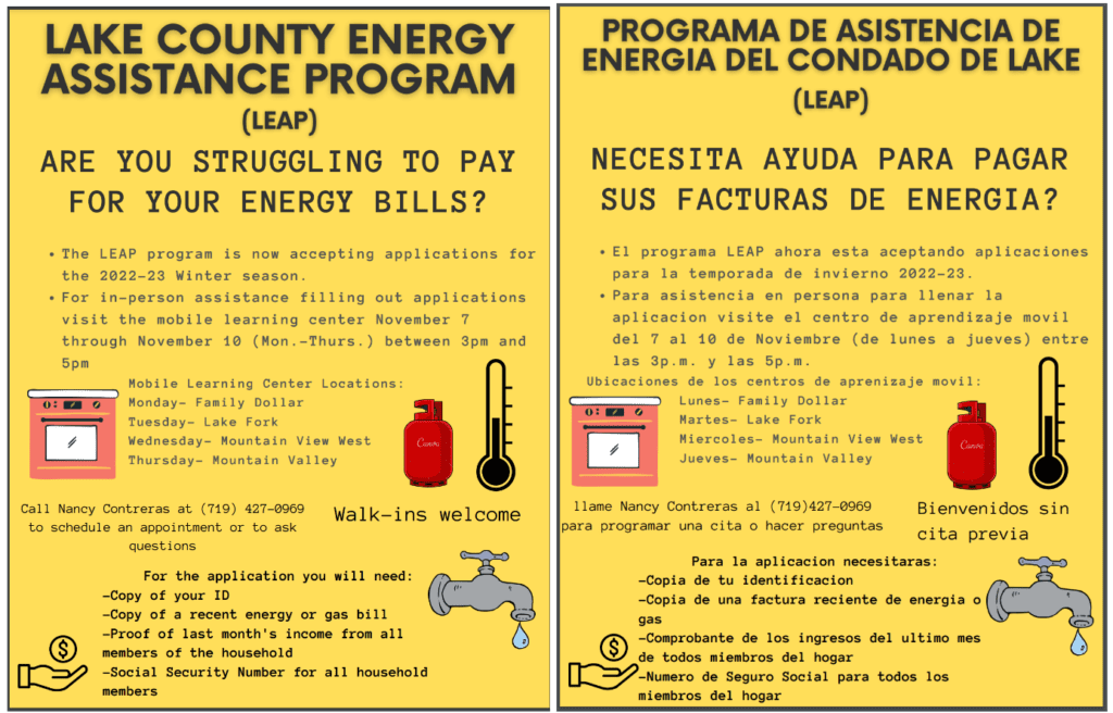 Are you worried about paying for your energy bills this winter? The Lake County Energy Assistance Program (LEAP) may be able to help. Call Nancy Contreras at 719-427-0969 for more information and/or to schedule an appointment.