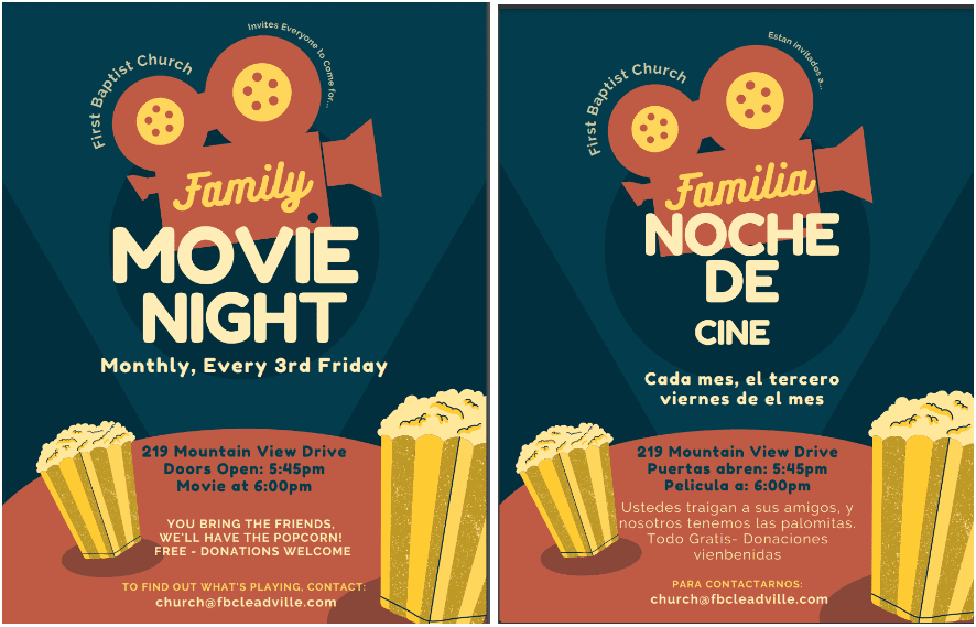 First Baptist Church of Leadville hosts a free monthly family movie night! Movie nights are the 3rd Friday of the month. We hope to see you for our FREE movie (with popcorn!). Licensing constraints prevent us from always being able to advertise the movie titles, but you can always email church@fbcleadville.com to ask about this month’s movie!