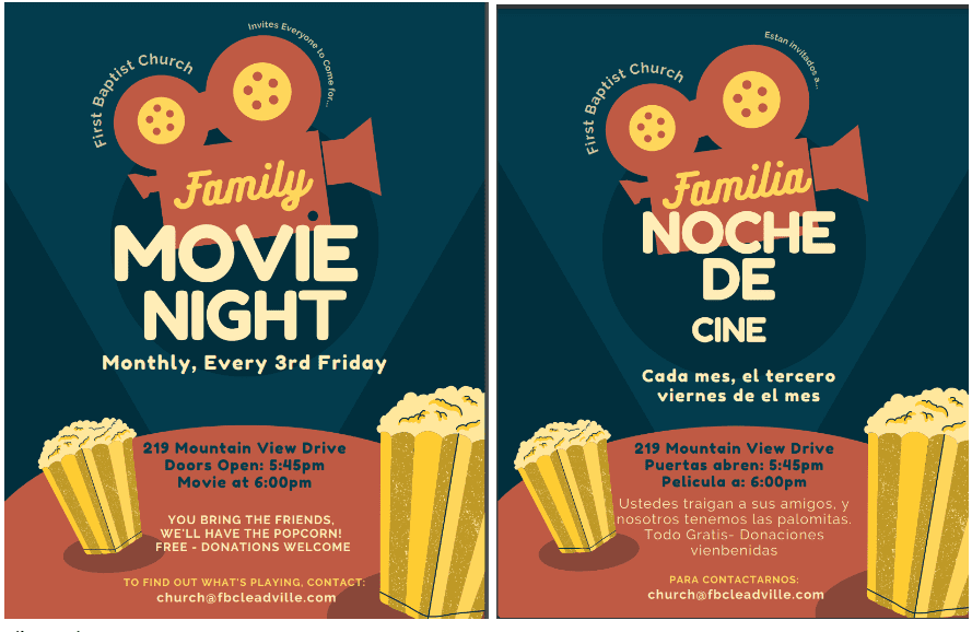 First Baptist Church of Leadville hosts a free monthly family movie night! Movie nights are the 3rd Friday of the month. We hope to see you for our FREE movie (with popcorn!). Licensing constraints prevent us from always being able to advertise the movie titles, but you can always email church@fbcleadville.com to ask about this month’s movie!