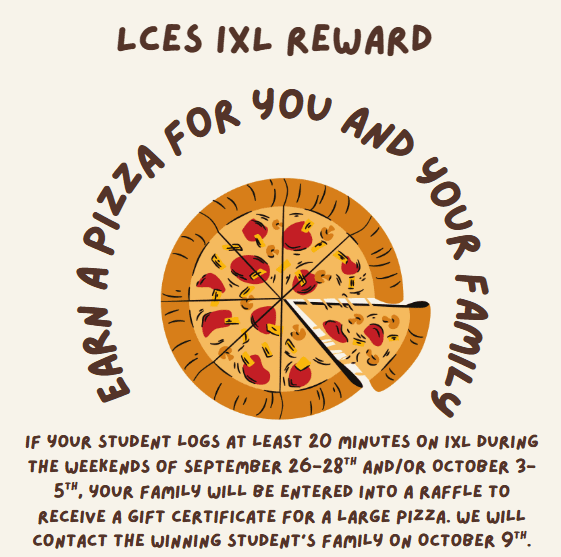 IXL: This week marks the start of our first IXL pizza challenge (see flyer below). If your student logs at least 20 minutes on IXL during the weekends of September 26-28th and/or October 3-5th, your family will be entered into a raffle to receive a gift certificate for a large pizza. We will contact the winning student’s family on October 9th. We look forward to seeing student growth excel in partnership with IXL and continued reading at home. If you have any questions about how to login and utilize this resource, please do not hesitate to reach out to me at blovely@lakecountyschools.net. Good luck and happy IXL-ing!