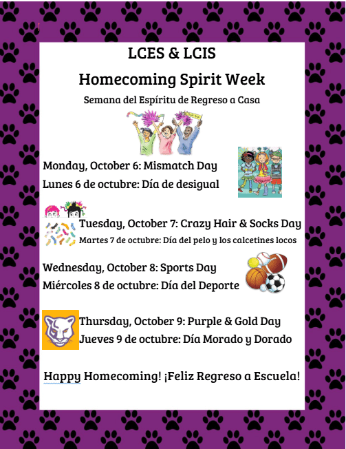 Happy October, Panther families! Next week is Homecoming week at Lake County School District and we are excited to celebrate with spirit week and the Homecoming parade on Thursday at 4:15 on Harrison Avenue. See you there!