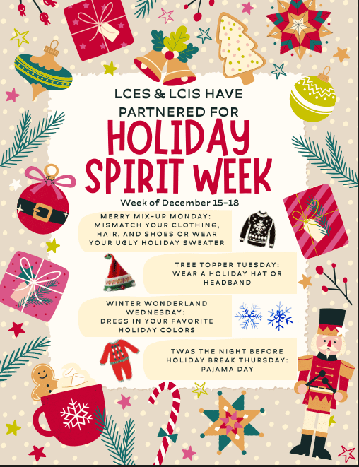 Next week is Holiday Spirit Week, a time to have fun and celebrate the Holiday Season!