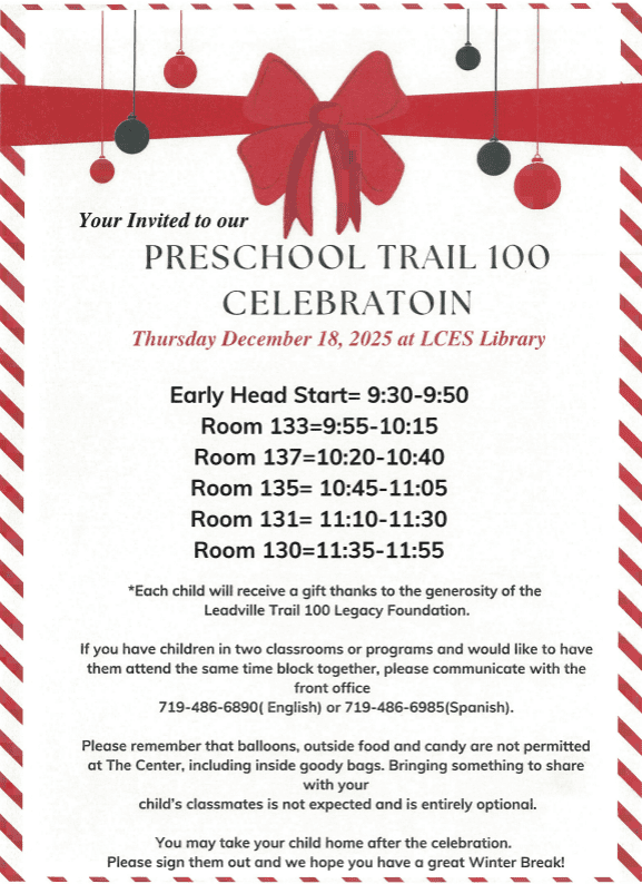 Next week is Spirit Week! See the attached flier for our themed days to dress in holiday style. We also have the Trail 100 Preschool Celebrations. Each classroom has a scheduled time in the LCES library. Every child enrolled at The Center will receive a gift funded by the Trail 100 Legacy Foundation. Here is the schedule: