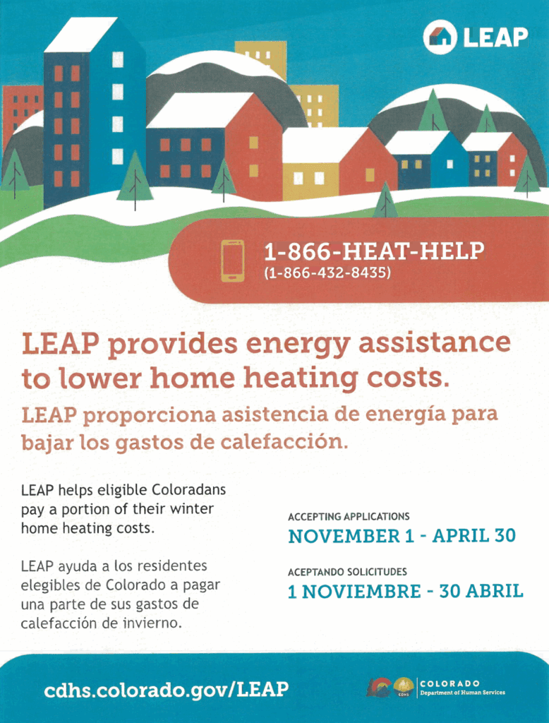 First, LEAP is a program that helps eligible Colorado families pay a portion of their heating costs. A flier for more information is attached or you can go to cdhs.colorado.gov/LEAP for more information. LEAP brochures and applications are also available in the Parent Corner near the Preschool Entrance.