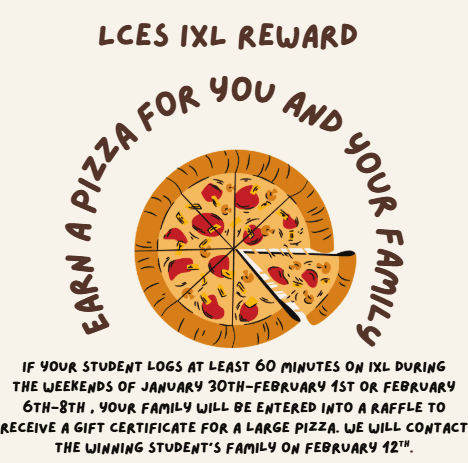 IXL: This weekend continues our next IXL pizza gift certificate challenge! Students who log on and complete at least 60 minutes of IXL skills practice between the next two weekends, will be entered into a raffle for a pizza gift certificate. The challenge will conclude on Monday, February 9. IXL is research based and proven to have a strong impact on student academic achievement. We encourage you to support your child in using this platform at home. Please reach out if you have any questions about how to login and thank you for reading to your child or using IXL.