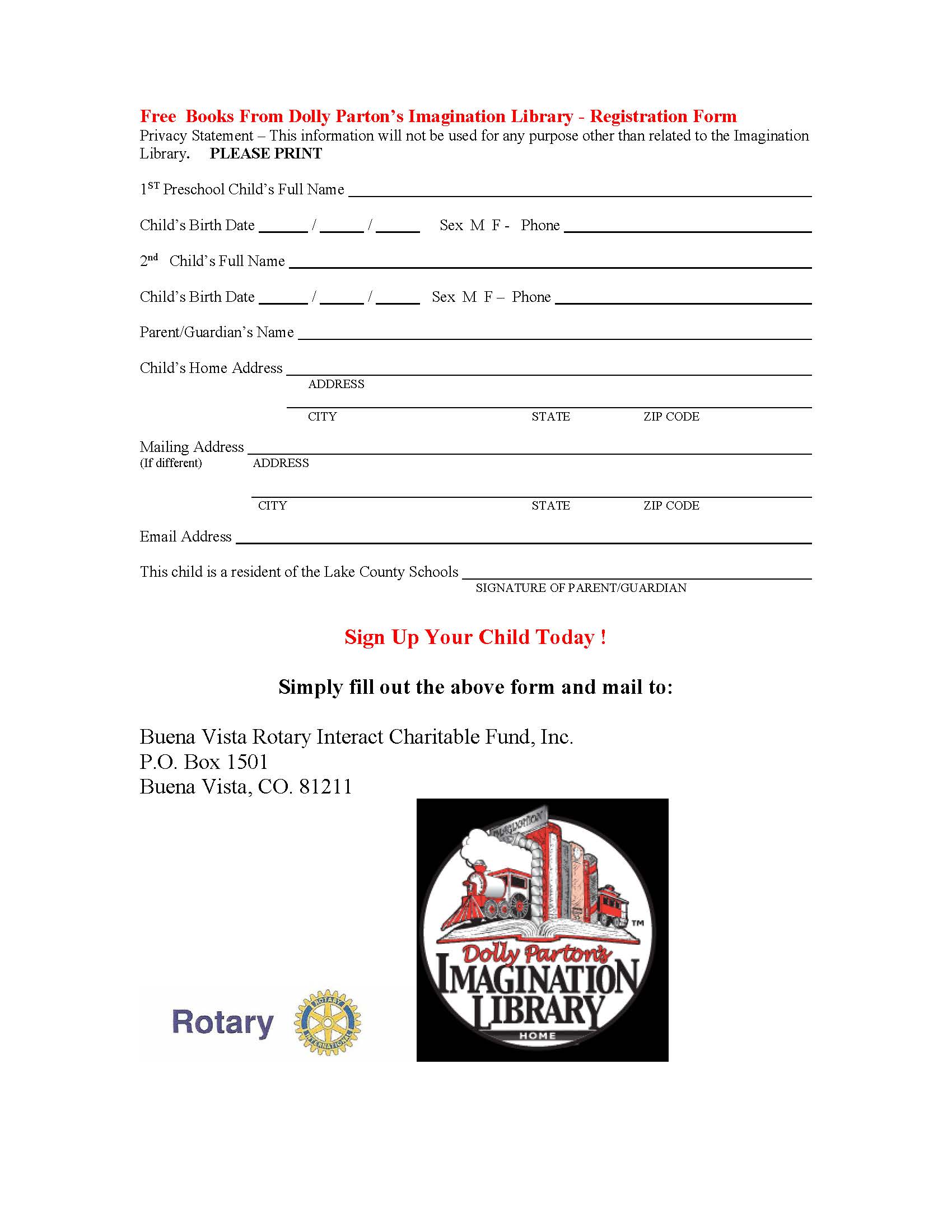 Would you like your child (ages 0-5) to receive a new book each month in the mail at no cost to you? The Buena Vista Rotary Interact Charitable Fund is excited to bring Dolly Parton’s Imagination Library program to the Leadville School District.